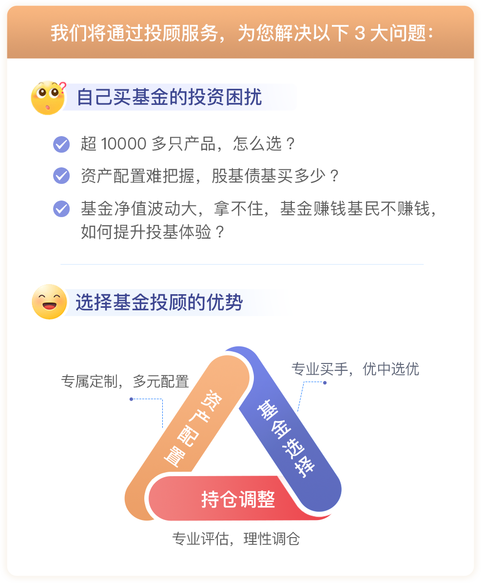 風(fēng)險(xiǎn)提示:本公司承諾本著勤勉盡責(zé)、誠(chéng)實(shí)守信的原則,為投資者提供基金投顧服務(wù),但不保證各投顧組合一定盈利,不保證最低收益,也不保證投資者所選擇的投資組合策略能夠達(dá)到投資者期望的投資收益目標(biāo)。投資者參與基金投資顧問(wèn)業(yè)務(wù),存在本金虧損的風(fēng)險(xiǎn),投資者自行承擔(dān)投資風(fēng)險(xiǎn)。投顧業(yè)務(wù)的過(guò)往業(yè)績(jī)并不預(yù)示其未來(lái)表現(xiàn),為其他客戶創(chuàng)造的收益并不構(gòu)成業(yè)績(jī)表現(xiàn)的保證?;鹜顿Y顧問(wèn)業(yè)務(wù)尚處于試點(diǎn)階段,存在因試點(diǎn)資格被取消不能繼續(xù)提供服務(wù)的風(fēng)險(xiǎn)。